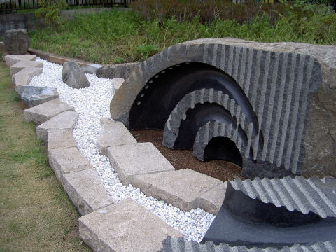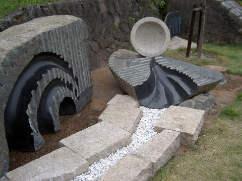 (集落移転にともない失われた家屋にあった、庭石、石臼を用いて制作)